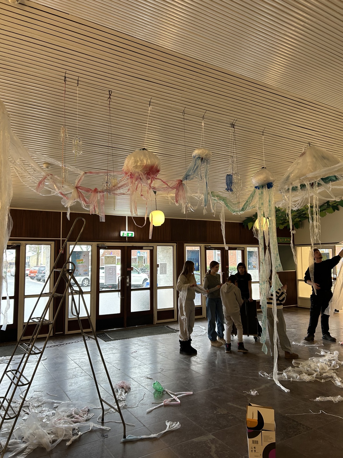 Værkerne er resultatet af et længerevarende billedkunst og klimaprojekt, hvor eleverne i grupper har arbejdet med plastaffald, genbrug og klimabevidsthed. Plastikken er indsamlet fra Netto og hjemmefra og er blevet forvandlet til installationskunst og mixed media-værker med tydelige budskaber om natur, dyr og ansvar.